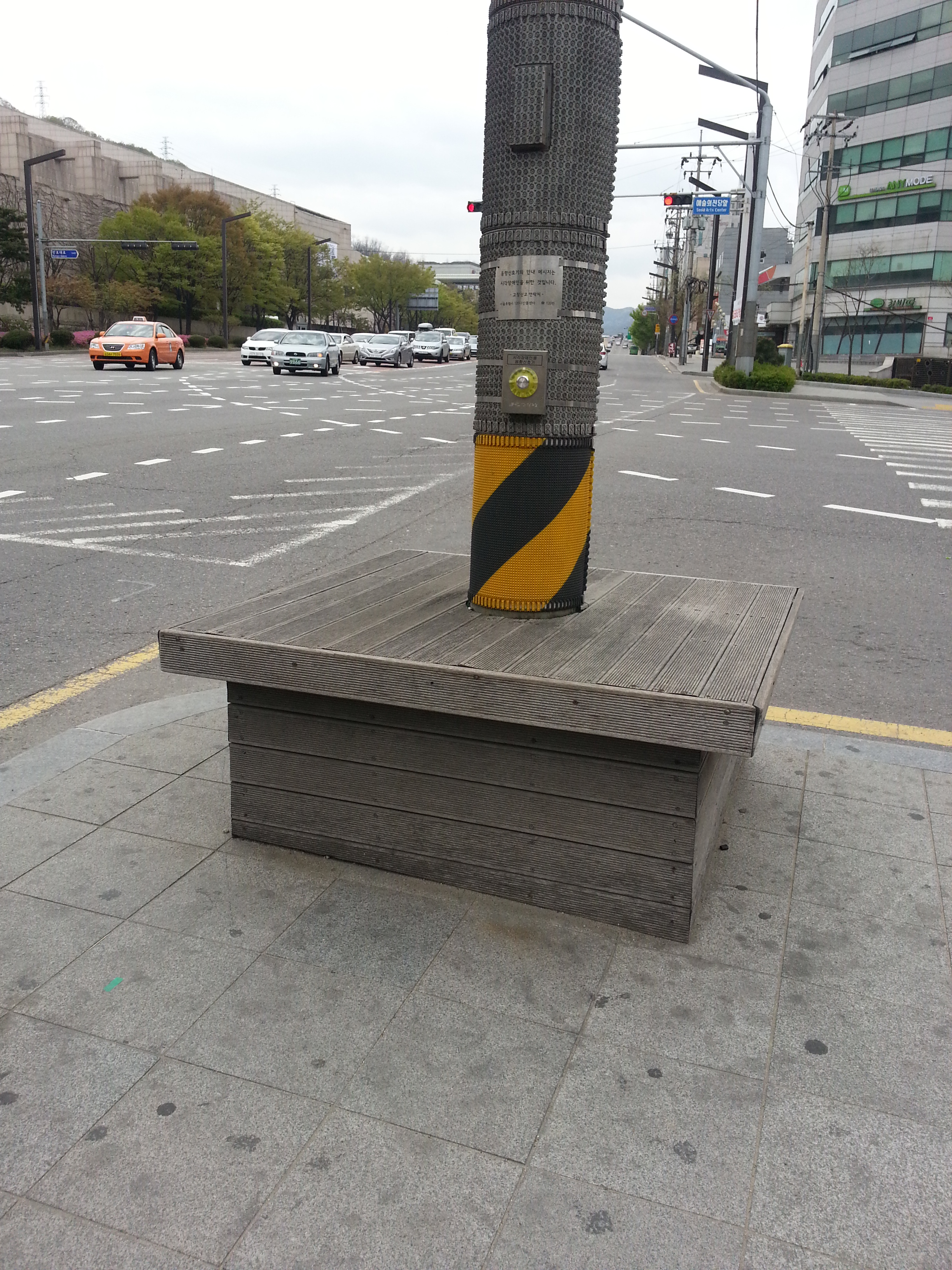 예술의 전당 앞 횡단보도의 음향신호기가 화단 혹은 벤치가 설치되어 있어