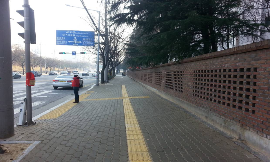 하지만 위와같은 사례에서는 굴절지점이 안전상 문제가 없는지점으로 보이며, 잘못된 정보를 주고있는 굴절지점부터 벽쪽으로 깔려있는 선형블록을 삭제하셔야 합니다.