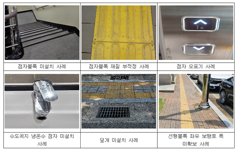 현장 조사에서는 단순한 미설치를 넘어 부적정 설치 사례도 다수 확인됐다. 시각장애인 편의시설이 설치되어 있음에도 재질이 기준에 부합하지 않거나 점자 표기가 잘못 기재된 사례가 확인됐으며, 수도꼭지의 냉·온수 구분 점자가 누락된 경우도 있었다. 또한 흰지팡이가 걸리거나 빠질 위험이 있는 배수시설에 보호 덮개가 설치되지 않은 사례와, 선형블록 주변 보행로 폭이 확보되지 않은 사례도 다수 확인됐다. 이러한 문제들은 시각장애인의 안전한 이동을 저해하는 주요 위험 요인으로 지적된다.