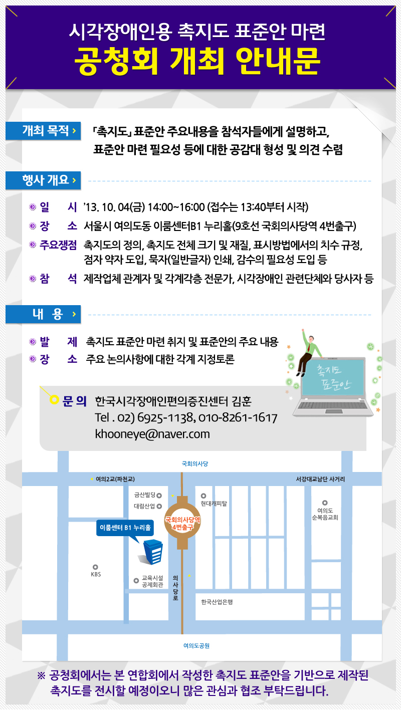 ※ 공청회에서는 본 연합회에서 작성한 촉지도 표준안을 기반으로 제작된 촉지도를 전시할 예정이오니 많은 관심과 협조 부탁드립니다.