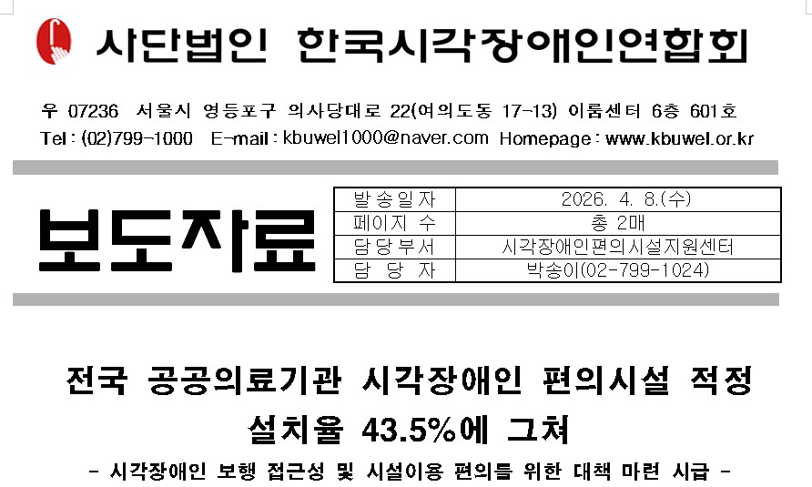 | 29 | [보도자료] 전국 공공의료기관 시각장애인 편의시설... (댓글:1건) | 첨부파일 3개 있음 | 시각편의센터 | 2026-04-10 | 46 | |